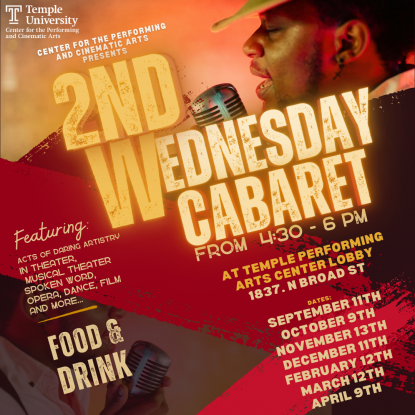Wednesday, September 11 will feature: Sophie Yerxa Robinson, Poem, Ode to Patrick Swayze Lucianna Astorga and collaborative pianist Kim Barroso performing "Quando m'en vo" (As I Walk By) from La Bohème by Giacomo Puccini Kendall Harris, with Adenike Onanuga on acoustic guitar, Song poem Poetry As Performance Class And special guest... CPCA Alum and Distinguished Visiting Professor Bryan Terrell Clark ('03) Clark is an elite level talent of TV, Film and Theater having starred in numerous Broadway shows – he has a Grammy Award nomination for his work as Marvin Gaye in Motown the Musical and appeared in Hamilton (as George Washington). Clark has also been a featured role on Snowpiercer on A&E and is currently featured on a new TV show on BET+ entitled Diarra From Detroit. TPAC Main Lobby Free admission, no tickets required Are you a student singer, scene maker, spoken word artist, filmmaker, dancer, musician or have another talent you'd like to show off or work out? Take up the mic in a cabaret atmosphere with food, drinks, and good friends. Click here to learn more. |